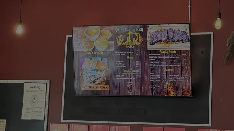 Swine dining is a good place for local BBQ.Walking in, you can already smell the smokiness of the meats, but it's not overbearing. Good quality meats. The Mac and cheese has a really nice Smokey taste which was a nice surprise trying it out for the first time. I know it matters to some, but not all; they stock Coca Cola products!Parking is ample, but also shares a parking lot with the tire shop next door.Service is nice and pretty typical of a BBQ spot; you order at the counter and the food is brought out to you.