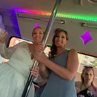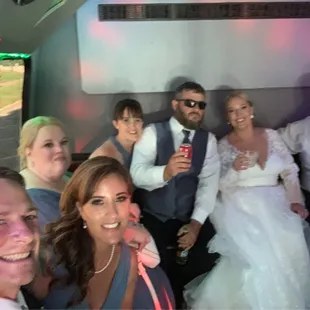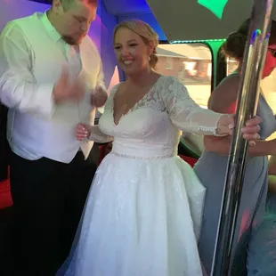 My sister-in-law booked a 2 hour ride with them after her wedding and we all got on at the church. I'm not sure how much it cost. I know if you throw up it's $250. None of us did that. Music is controlled by Bluetooth. The driver was absolutely amazing. Offered assistance getting on the bus. Carried the box of flowers for us and even helped my sister-in-law bustle her dress! We had a great time!