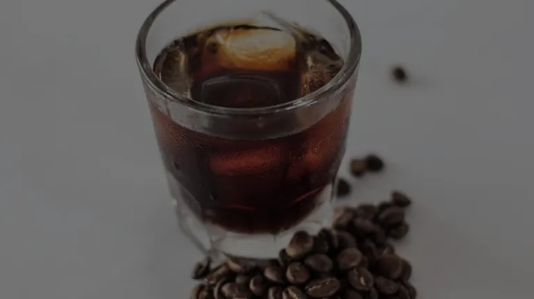 a glass of coffee and coffee beans