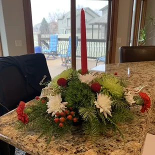 I orderd a christmas center piece for my mom from out of state. Im always worried about the quality of what you might get when ordering from across the country but it was incredible when it arrived! My mom was so happy she almost cried.Thanks for the fast, friendly and super nice centerpiece. Ill be back next time i need flowers.