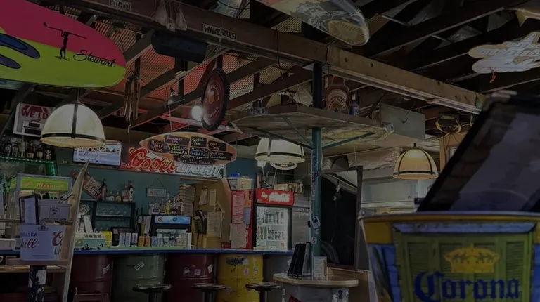 Interior with candy machines and various sea/surf-related items in the rafters.