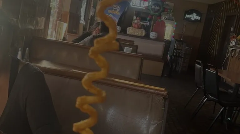 Love this place! Upon entering you are always greeted by someone behind the counter. Seems like a family owned business. This is a sports themed wing house and is filled with decor for sports lovers.I always get the 10 piece wings with the house made BBQ which is so so good!Curly fries are always a hit as well! Check out this fry I found! Would highly recommend this place for good eats and good quality food!
