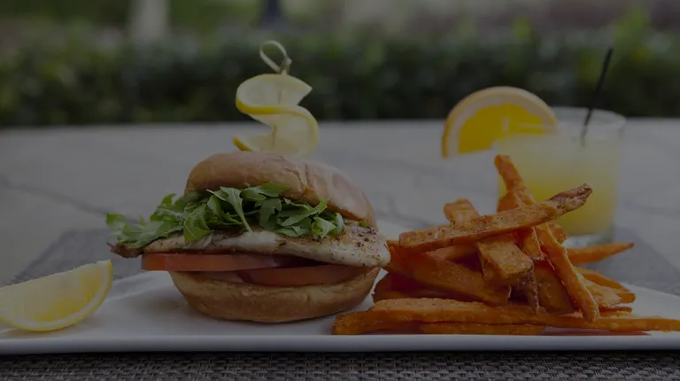 After we arrived and checked in our villas us golf WAGs were hungry so we decided to check out the restaurant. It was freezing inside so we sat outside. Beautiful view of the Palmers course. I ordered the wild berry mojito. They were out of fresh mint but the mix still had mint flavor in it. Pretty sweet but tasty. For my entree I went with the crispy fish sandwich. It was bland as I did not taste the spice in the spicy remoulade. Seasoned fries were nice.