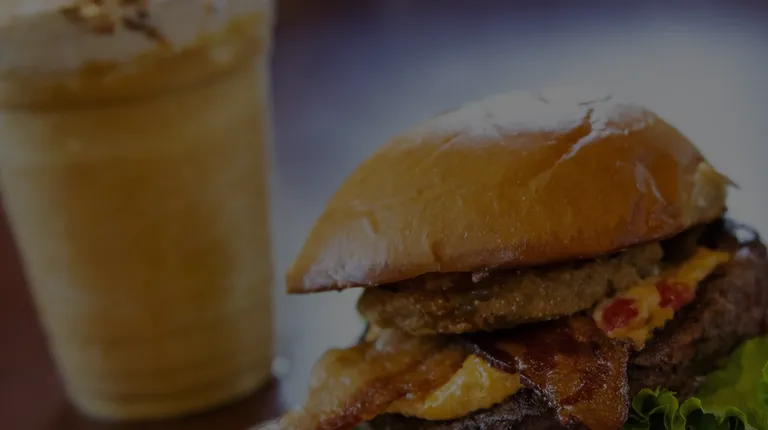 Southern Classic Burger - Signature Blend topped with a Fried Green Tomato, Pimento Cheese, Lettuce, and Bacon