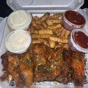 Lemon pepper wings, seasoned fries, and homemade ranch.
