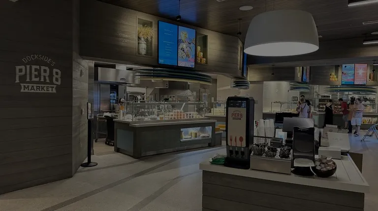 Stayed at Dockside for 11 days, so we ate here quite a few times during our stay. In my opinion, the food is mediocre and not worth the price. If you're planning on eating here a lot I suggest looking into the many options around the hotel that are just a short drive away. I get the convenience of the cafeteria style offerings, but you'll grow tired of eating it believe me.The Pier 8 Market is on the lobby level near the Tower 1 breezeway. As mentioned before this is a cafeteria style dining option that offers several different counter to order at depending on what you're wanting. They also have several beverages (wine and beer selections as well), fresh fruit, salad bar, and a section for grab n go sandwiches, chips, and ice cream.Pro tip: they have an option of buying a refillable souvenir cup. Depending on the amount of time you're here will determine the price, but you'll get unlimited refills. The cups are very small and don't fit a lot in them, so you'll be needing to refill them often. But is convenient to have for pool/resort days if you need one and doubles as a take home gift.On to the food: the chicken and waffles was pretty good. Chicken was crispy and juicy - the waffles were alright, nothing special here. The pizza is pretty good. Those two options were probably the best thing I ate at the market during my stay. They filled me up, but it wasn't over the top by any means. The bacon burger was not good. Bacon wasn't even cooked all the way and was flimsy. The Mac n cheese is nasty I recommend skipping if you're getting the chicken, go with the mashed potatoes.Our group didn't have a good experience with breakfast offerings. I had the steak and egg quesadilla and it had clearly been sitting on the warmer for a while. It was eatable, but upset my stomach once I got to the parks. Someone else got the ham and cheese croissant and he said it was rock hard and ended up throwing it away. Grab n go and the pastry/deserts were a great snack to grab! The donuts were alright along with several of their cheesecakes.If you're eating here, ask them to make it fresh; otherwise, you'll likely get something that has sat on a food warmer for an extended period of time. You'll have to wait longer, but it will make for a better dinning experience. You can get it for here to eat in the dinning room or to-go to eat in your room. Avoid peek dinner times to avoid long lines. Again, I suggest looking around the resort and getting a better meal for the same price.
