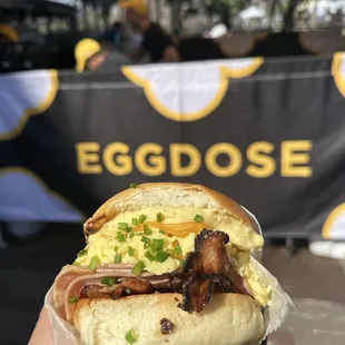 5 Resounding stars for the Maple Dose egg sandwich!!I had been hearing about Eggdose for a while and was lucky enough to try them at the Winter Garden Farmers Market last weekend. The line was a bit long, but let me tell you that it is SO worth it and the staff is HUSTLING under that tent.I got the Maple Dose which has the buns covered in powdered sugar that has been caramelized slightly, and there is maple syrup on it (incl an extra shot of syrup if you want to dunk- but I didn't use that). The salty/sweet combo was everything I desired and more! AND, the size was MUCH bigger than I anticipated. The picture is deceptively small, but I probably could have shared this!Overall, this totally hit the spot and fueled my for a day at the market (and I skipped lunch because I was so full from finishing the entire thing!).