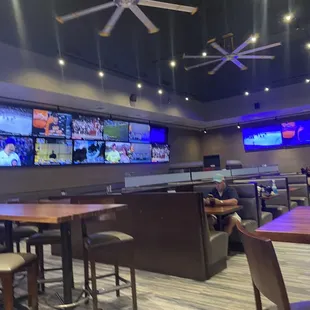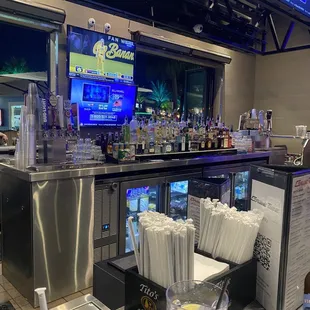 huge bar with tvs and seats to get food.