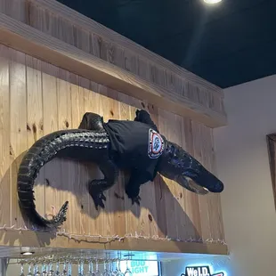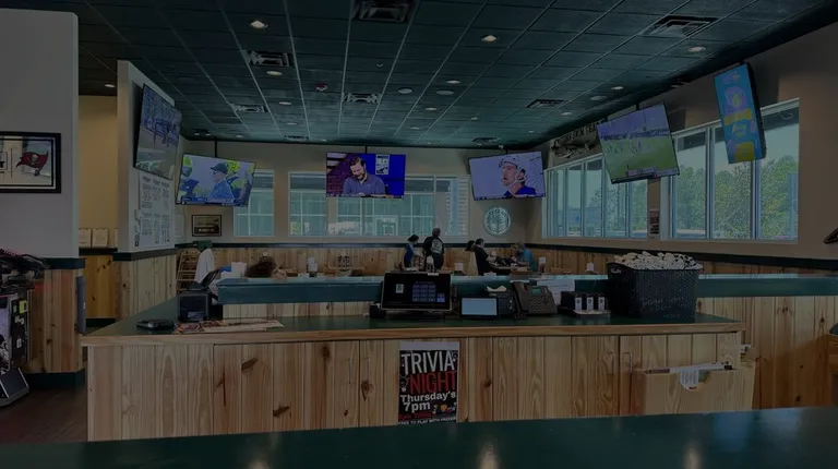 Digital advertising in the center of the bar shows Gator's specials but also outside advertising like this one for a roofing company.