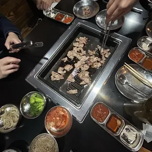 I had been wanting to try this place for a long time, the meat photos always looked so tempting! I finally made a reservation for a table of nine for dinner. When we arrived, we were seated right away. The service was excellent, fast and attentive. The staff kept checking on our table and changing the grill regularly.We opted for the premium AYCE, and the meat selection was pretty good! Our favorites were the short rib steak, galbi, pork jowl, and shrimp. I was excited to try the small and large intestines, but they were just okay, not as flavorful as I had hoped. The side dishes were all delicious as well.Overall, it was a great meal, but if you have kids, this might not be the best spot to bring them. They charge $29 per child, and my kids, who are six and under, didn't eat much. As a family of five, our bill came out to $179 with tip, which is quite a bit more compared to other AYCE places. This spot might be better suited for a date night instead!