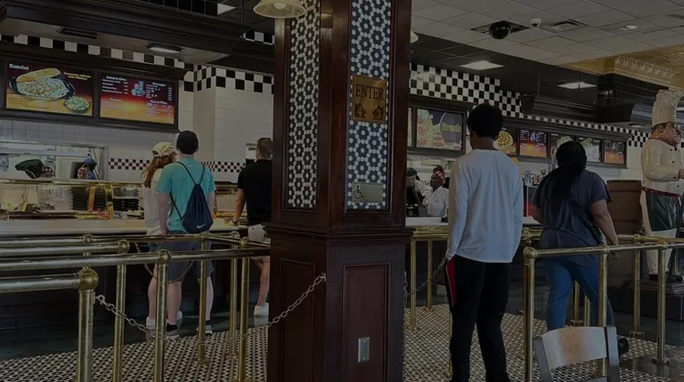 Very busy but easy to find a table. We ordered a supreme pizza and meatball sub. Workers delivered our food and came around to get our trash. The price is expectedly crazy high but the pizza was solid. Chewy dough and a plentiful of toppings, I was very satisfied. A stand by the doors has utensils and cheese and pepper packets as well.This is more about the amusement park as a whole but the soda cups can only be filled once, since they have a scanner on the bottom. I did not know and only filled my cup 1/3 since I only wanted to try a soda flavor and get more if i liked it. I could tell a lot of other people didn't know this either. Felt scammed. Water is free though.