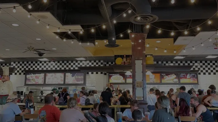Elaborate Simpsons themed food court. Options include pizza, fried chicken/sandwiches, burgers, fish and chips, or salads. Beat the lunch rush by getting there at 11am or so. Fried chicken really tasted like frozen fried chicken that you buy at a grocery store frozen section along with the pizza is not that much better tasting than frozen pizza either. It is included in the dining plan but the interior doesn't feel very comfortable, actually feels a little dirty even tho they disinfect the table. Overall not a great lunch experience, I think you'd be better off getting a corn dog or tacos at one of the carts or outdoor vendors.