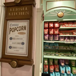 The Main Street Confectionery is a large store that takes up part of Town square. It has everything for your sweet tooth. Many of the items are huge and probably meant for sharing. I did inquire about shelf life only to learn their goods do not last very long.The place is always crowded. Being there over Hanukkah I saw that they had a Hanukkah display complete wtih candy coins and a box of truffles. Nearby is a counter that sells frosted treats and if you are willing can purchase a themed park sipper for an extra fee to go along with it.They have a kitchen towards the back but what is real unique is that you can select your own candied popcorn here. Not only can you choose the flavor but also choose whatever toppings you want in it. It gives a sweet touch to your popcorn.Seeing that the store sits on Main St you can literally walk into the other stores that are along that side of the street without going outside. I purchased my Hanukkah truffles and was off. It comes packaged in a box which you can easily put on a plane without difficulty and makes a great gift. Next time you are craving something sweet, check out the confectionery. You won't be disappointed.