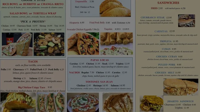 Choice of cilantro or yellow rice and pink or black beans, pico de gallo, sweet plantains, avocado, and cilantro sauce.