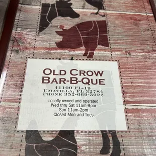 Want good BBQ with good service? Old Crow meets the bill. We have dined here 5-6 times, almost always late in the day, and are always pleased to return. I enjoy the brisket. Let me know what you like!