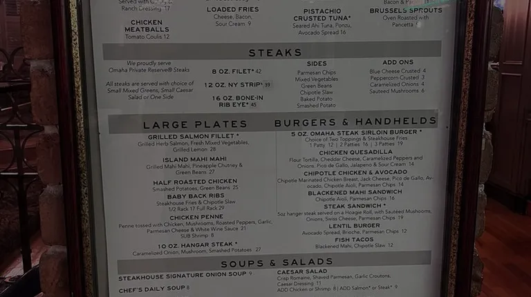 we went there on a Monday late at night very close to closing time ordered a 16 oz bone in ribeye, my wife had sourdough shell, shrimp and grandson had a kids burger and we ordered guacamole. The service was outstanding, very professional, courteous, kind make sure that we were being attended the right way made sure that if we need water they will give us a water without us, asking the drinks were just fabulous strongly recommend this restaurant. In fact, on holy thirsty, we decided to stay at the hotel to dine in and go to the Omaha steakhouse restaurant again and try their salmon. Which we did and it was just out of this world. Their prices are very very reasonable.