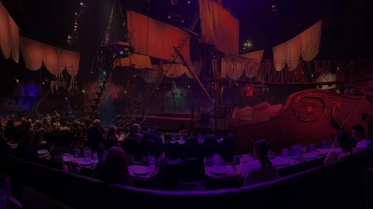 This place was so much fun! I can't tell you it's been a couple of decades that I've known about the pirate dinner adventure show, and we never seem to make it which is crazy because my son is an absolute pirate fanatic and has been his entire life. We decided for his 17th birthday that we would check out the pirate, dinner adventure and see what it was all about.In the other reviews you'll see mentions of up selling on everything and that's not incorrect. They want to upgrade you on your dinner and upgrade you with appetizers and upgrade your beverage package and upgrade your drink to include a souvenir cup but what do you expect? it's off international drive they catered tourist and they're just trying to make a buck. You can't really hate them for that. I will say that as I read in another Review oddly the gift shop has a no prices on anything if you want to know how much something is you have to ask and they certainly offer the service. Would you like to know how much that is or would you like to purchase one of those can we wrap one of those up for you, sir? You get the idea but again they're just trying to make a buck. OK let's talk about the show it's amazing and it's long I mean I'm talking like it's two hours long. I had no idea that it would be as live action as it was as good as it was or the fact that it would all be live voices, singing, and acting. These performers are serious athletes and it is a very active show. I'll also add that for the most part it's pretty darn entertaining. The stage is huge the cast is quite large they make full use of the set because you'll see the actors flying through the air on ropes, jumping into nets, and at some even paddling a row boat!Audience participation. Sure does make this great, and we got lucky because there was a local high school having one of their senior trips/events at the pirate adventure dinner theater that night so it was a lively group and there's no question that when they don't have a group of lame ducks for their audience. The actors are really into the show and excited to do it. We had a great time .My suggestions are pass on the upgrades. I'll mention the food briefly. It's mediocre at best but you're going for the show. They just happen to serve dinner that's the way I see it. I highly recommended the show.