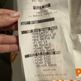 We had a not so great experience with using the app (not user friendly- hard to navigate backwards, cannot view cart) to picking up our order from this location. Order said it would be ready by 7:20 pm. We waited in store for at least 30 or more minutes after our pickup time. In store, NO ONE acknowledged us and apologized for the wait or even let us know how much longer we would have to wait for the food. All employees were working the drive thru. We finally got our bag and headed home. Our mistake for not checking because we were missing our large order of fries and the buttermilk ranch we requested. (All this was printed on our receipt... so they were definitely part of our order). The wings were actually decent, thus making this two stars instead of one...