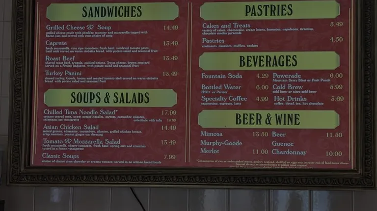 This is another quick bite location but with shades table outside. There's also 2 freestyle machine right next by it.This place is good for either dessert like cakes or pastry or for a sandwich. There's multiple type of sandwich and grilled cheese. There's also same salads that you can take and even soup.I tried the devils food cake which is a chocolate cake. It was light but chocolate enough for the scorching July heat. I normally prefer my cake denser and heavier on the chocolate side but for a theme park offering and light snack, it fill it properly.My girlfriend tried on of the sandwich that came with a side of potato salad and fresh fruits. Everything was very good and fresh.Service is fast and done with a smile. I side as AC blasting off also. It seems to be a hidden gems cause ei never saw any line here.