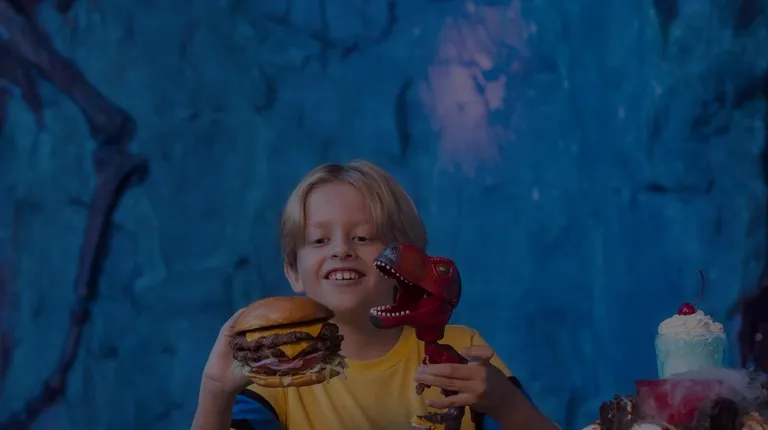 I feel like the food is a THREE but the service made this place a four. The hostess helped three of our reservations sit together it was a crowd of twenty! The kids got a table and the adults got a table. Our waiter got drinks out quickly and food as reasonable of a timing as possible. Every thirty minutes the restaraunt has a light "show" -room gets dark and lights flash and sounds happen. Dinosaurs move a little bit. Like I said. Food is mediocre and pricey. But our kids LOVED it. They also have a sandy rocky area that they can dig up and reveal dinosaur fossils.