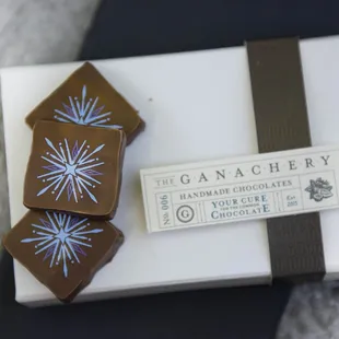 House-made ganaches. Available for purchase by the piece of in boxes of 6, 9 or 12.