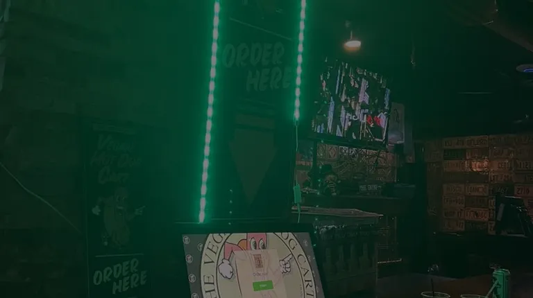 I found myself walking the streets of downtown Orlando and ran across this interesting spot. I wasn't sure on first glance if it was a regular bar with a nostalgic vegan hot dog cart sign hanging over the door or if the hot dog cart was inside. I'm adventurous so I wonder over to investigate. I parked at the bar and ordered a pint of beer while I surveyed the rest of the place. I hadn't quite figured out the vegan hot dog cart at this point, but I don't give up that easily. The bar was dark, dank and stank, like old bar and pubs do when they're not clean very often or very well. The toilet was a whole different kind of hot mess and a horrible experience. I don't recommend using it.Back to reason for going in this bar. After spotting a dart board in the back of the dark, dank stank place, my friend and I ventured over in that direction. That's when I spotted the infamous vegan hot dog cart kiosk on the side of the bar. The only reason I don't have a picture of the kiosk is because I was distracted with every step I took. The floors were so sticky that it felt like we were walking on wet glue. Now that I'd committed to the whole vegan hot dog cart experience, I had no choice but to cash in my dignity, self-respect and germophobe tendencies and do the thing. I believe there were 3 or 4 standards to choose from and the option to create your own. I went in for the Cincinnati dog with chili, spring onions, cheese and something else. It cost about $10, and I waited for the text message from the kitchen to return to the bar and pick up window. The presentation wasn't bad but because there were so many other competing factors going on in this place, I took a bite but not a picture and exited staged left immediately. I can't in good conscience recommend this place to anyone, no one comes to mind.