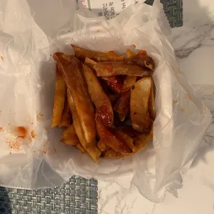 Fries were burnt and looked like the little pieces from the end of the bag. Asked for salt , pepper, and ketchup on fries and they didn't put anything on them. Burger was on bun almost twice the size of the burger.
