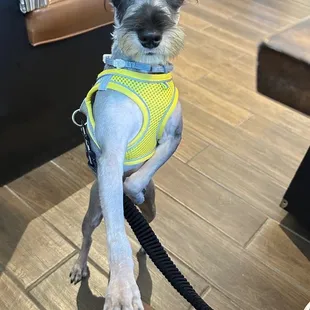 a small dog wearing a yellow vest
