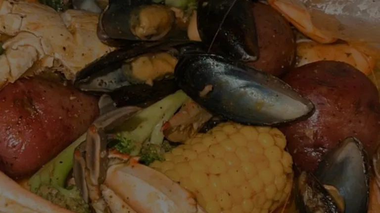crab legs, corn, potatoes, and corn on the cob