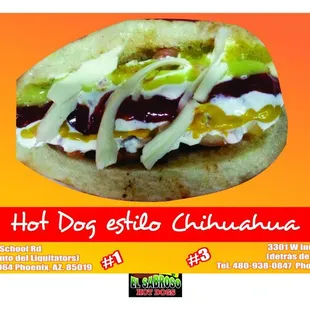 Tomato, beans, bacon, sauteed onions, mayonnaise, nacho cheese, ketchup, guacamole, mustard, jalapeno sauce, and asadero cheese.