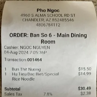 Our first time here after a long work day and craving some comfort food and that to me is a bowl of noodle soup even when it's 100+degrees outside. We decided to give this recently opened pho place in Chandler a try. I wanted clear noodle for my hu tieu, but their menu is limited, and it came with the same noodles you get with pho. Broth is good and overall was good, only thing lacking in this dish for my liking is liver, which should be included in this dish.