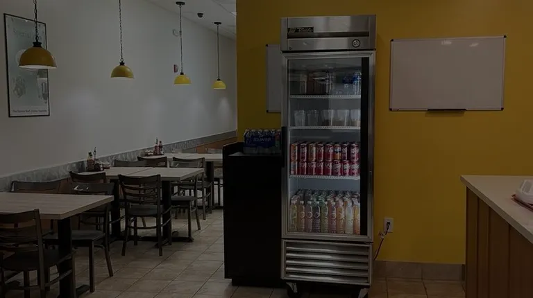 a restaurant counter with a menu on the wall