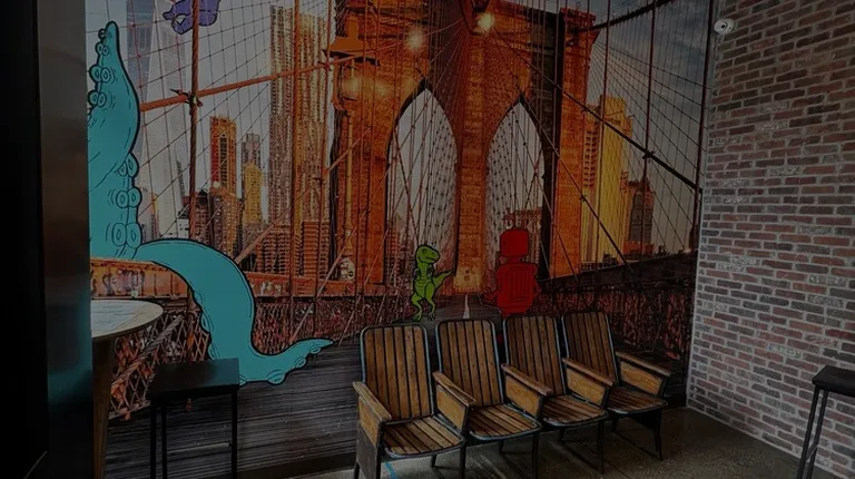 a brick wall with a mural of the brooklyn bridge