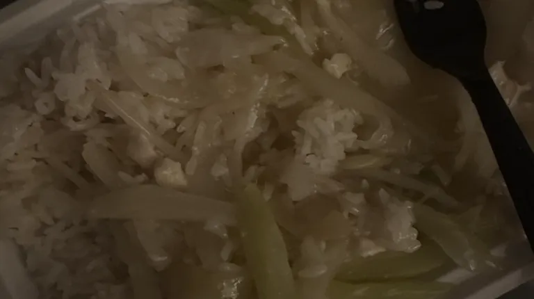 This is our House Special Fried Rice. It comes with pork, chicken, shrimp, and vegetables (onions and bean sprouts).