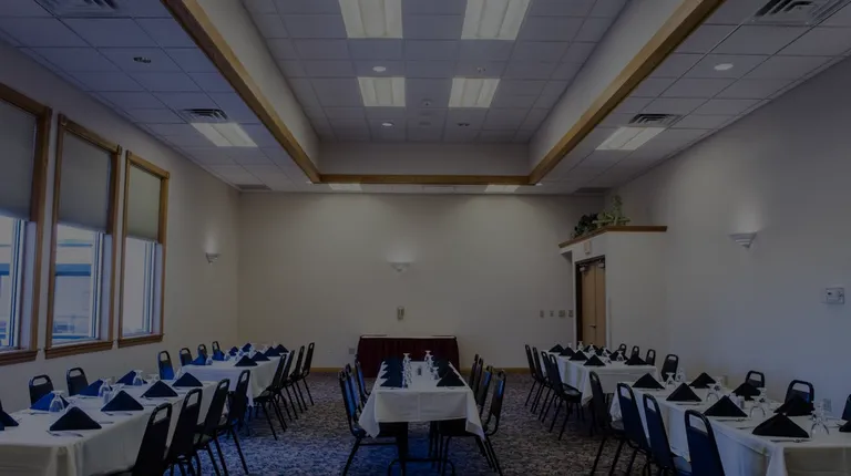 Banquet room set for a business dinner.
