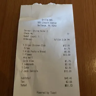 Came in on a Saturday afternoon. The waitress/bartender was very kind to us with good personality. I had the flame burger and it was good! My fiancé had the fried chicken club (not pictured) with a side of homemade fries. I tried his fries and they were hot and fresh. I had a side of coleslaw and only took one bite of it. It tasted weird like it may have been sitting.. my fiancé didn't notice anything off about it. My son enjoyed his pasta and he's quite the picky eater. I really enjoyed the prices for the amount of food you receive. It did start to get busier around 3pm as soon as we were getting ready to leave. I would come again when they have their live music.