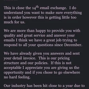 I am not usually a person to share a negative review of a business but.. this is necessary. In December, I reached out to Jaden's Catering located in Monroeville, PA for catering information for my baby shower in April.Our emails went back and forth until we solidified a package plan that would work best for us. After receiving our invoice, we decided to move forward and book the caterer. Please note-- there was no contract, no delivery time listed, no details in the invoice (see photo), and not much information.Well, here we are just about a month out from the shower and I had some questions (like what is included in mobileware and why the cost of my drinks had changed from my initial quote to the invoice).This was the response I received this morning (see photo). I am extremely disappointed and shocked that a business (who is struggling in a pandemic) would tell a customer to (insert explicit) off because they "asked too many questions."
