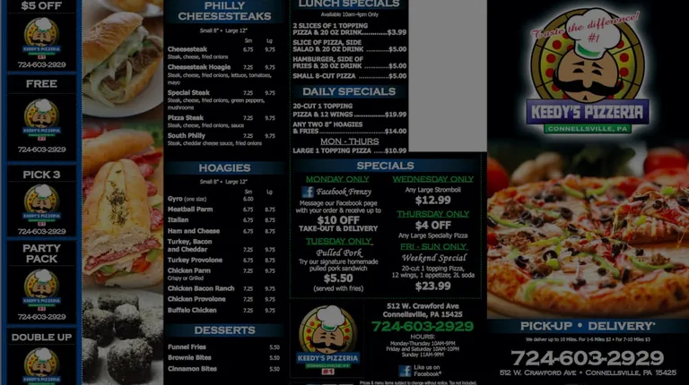 I've never stepped foot in Keedy's restaurant - yet. But I *have* ordered delivery many, many times. For starters, getting food delivered out here in the countryside is difficult, so kudos to them for servicing us. I don't particularly like paying $3 extra on top of my order because of where I live, but some restaurants charge extra just to deliver, period, so this isn't an out-of-the-ordinary charge, just an annoyance.The food is pretty good. I've had a sampling of most of the menu, from appetizers to desserts, and I can honestly say that the items I've eaten have been worth what I paid. The appetizers are all fried, as are all the desserts. Their fries are very tasty for a pizza place, as are the wings. The very first item I ordered was a regular stromboli, and I really liked it. Their sandwiches - hamburgers and subs - are generous, on good bread, and depending on what you order, range from okay to very good. I'm a picky eater, and I never found anything to be inedible. The pizza doesn't stand out, but that's okay - being just as good as your competition in this area is a compliment, as far as I'm concerned. All in all, my experience with Keedy's restaurant has been very positive. The only time I felt the need to complain was when a pizza was delivered with most of the toppings on one side, because the driver set it crooked on the way to my house. But otherwise, they do a great job, even when I make strange requests, like when I ask them to put lettuce & onions for my subs on the side so they'll be crisp when they get here and when I warm up leftovers, or when I make substitutions on the appetizer sampler. I'm not a big spender, either, being on a fixed income right now, but unlike other places that deliver, they don't have a minimum. I appreciate that they have Lunch Specials, Daily Specials, and other specials. Mondays, for instance, if you place your order via Facebook, you get a discount up to $10 off your order.With worthwhile food, reliable delivery, and meaningful specials, Keedy's Pizzeria gets 4 stars from me.