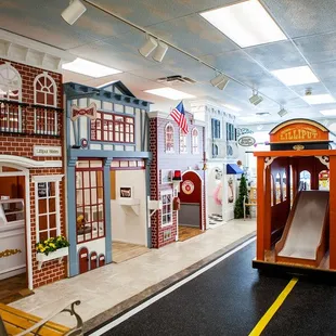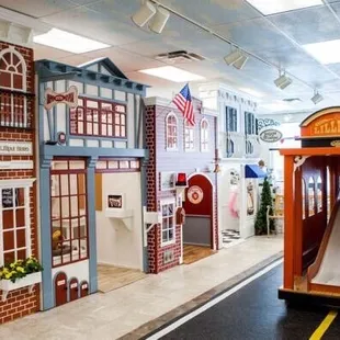 What an adorable play town for the kiddos. It's rather small on the inside but set up well. You enter and pay in the front. ($10 for unlimited time) There is a small kitchenette, tables/chairs and a bathroom in the back. The middle is set up to be a smaller version of Main St. USA. There are mini versions of a post office, beauty salon, fire station, doctors office, grocery store, ice cream parlor and more. There is also a trolley in the middle with a slide. All of the toys inside the shops were age appropriate and clean. Everything is very well maintained. The best part is that everything is enclosed with a gate so you can sit in one of the chairs in front or the back and watch the kids have a great time! By far my favorite preschool play place in the South Hills.