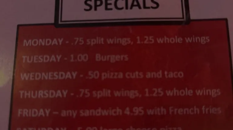 Great place for Thursday wing special50cent whole wingsWings are large with pretty standard sauces Also good fries,not greasy Great drink specials as well Saw other orders come out and they all looked good especially the sandwiches Welcoming atmosphere and plenty of parking