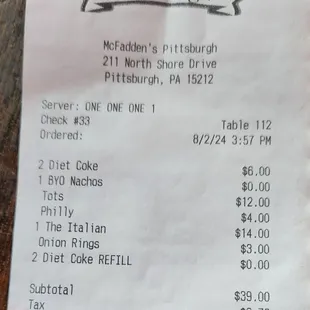 "You're not the only oneWith mixed emotionsAnd you're not the only shipAdrift on this ocean"(Rolling Stones)McFadden's was a real mixed bag for us. It was a Pirates game night, and the fans were starting to roll in. We grabbed dinner before the game and were pretty underwhelmed. Service was very slow, with long lapses.The food was good- Philly Steak Nachos with Tater Tots ($16) and an Italian Deli Panini ($14) with Onion Rings ($3). Soft drinks were $3 each.Besides the service issues, we found the restaurant to be in a state of disrepair. The tables were very "icky-sticky". Oh, let's talk about the restrooms too. There are three paper towel dispensers in each restroom. In the men's room all 3 were empty. In the ladies' room, one was empty.Now in baseball 2 out of 6 equates to a .300 batting average which is terrific.But when it comes to availability of paper towels, that's an epic fail.