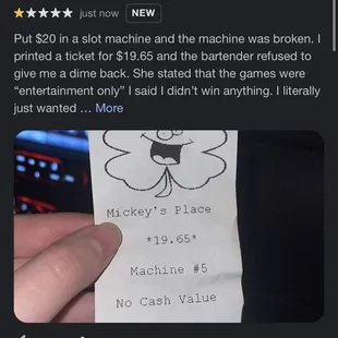 A complete scam, already reviewed them on Google. I got $20 out of their ATM and played their slot machines. The machine broke after 1 spin and made me print my ticket. When I tried to get my money back ($19.60) the bartender refused. Claiming their slots are "entertainment only" and don't pay. I wasn't asking for a pay. I was asking for my money back. Bartender was really rude and nasty. It was my boyfriend & I's first time there after bowling and we will not be back to either The bowling alley was pretty disgusting and the bar was extremely disgusting. We both had 1 drink since the bar is connected to the bowling alley- then we left. Really a rough crowd as well!