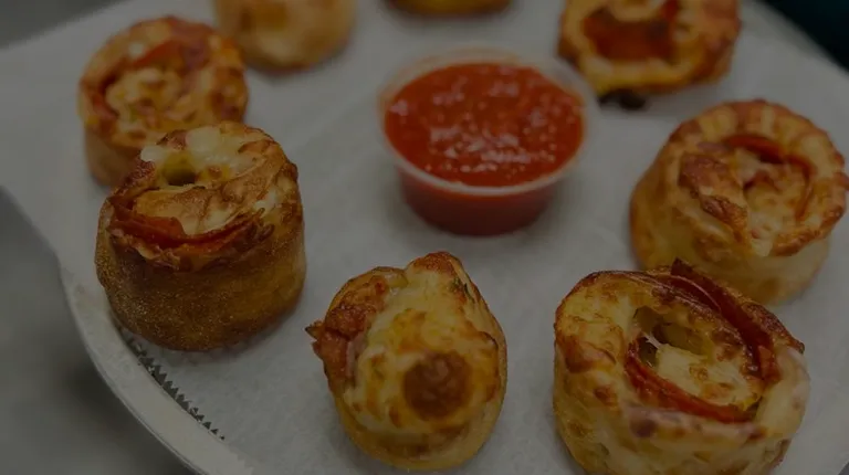 a person holding a plate of mini pizzas
