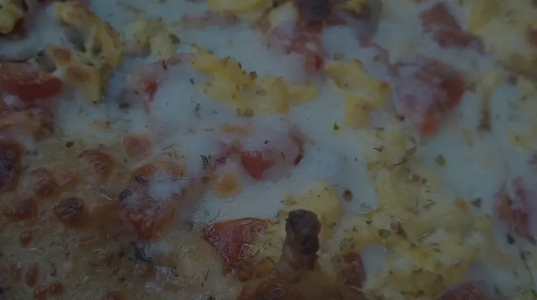 Breakfast pizza with homemade crust perfect cornmeal dusting. We got half bacon & sausage and tomato. Personal is 12 in. Awesome.