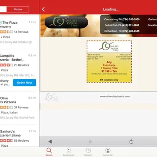 If you're tired of the traditional, boring cheese pizza, Olive Oil's Pizzeria is for you! Their menu is full of so many different and unique pizza toppings and varieties, it was so hard to choose!We ordered a chicken pesto pizza for delivery, and it arrived quickly and piping hot. The pizza was loaded with toppings, and all of the flavors worked perfectly together. We wish we got the large because it was so good, and we still wanted more when it was gone. We didn't realize until after we ordered, but on Yelp there's a coupon for a free order of breadsticks, too! We will definitely be ordering from here again to try out some of the other intriguing options, as well as to take advantage of those free breadsticks!