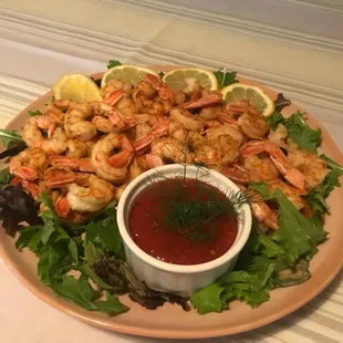 Grilled shrimp with fresh, seasonal vegetables.