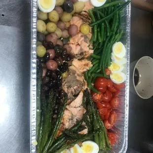 Salmon nicoise salad with baby potatoes, french green beans, assorted olives, grilled salmon, tomatoes, eggs, with light citrus vinaigrette.