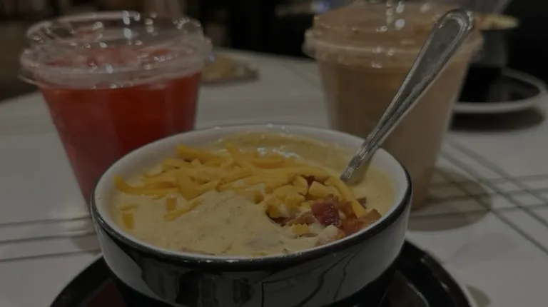My daughter and I had an event at SRU. Deciding we deserved a treat (and needed lunch), so we popped in here. The young lady at the counter was very friendly and the cafe itself with rough hewn log panels, exposed brick wall, filled with antique signage, and adorably mismatched furnishing is the cutest vibe ever!My daughter ordered an iced butterscotch DECAFFEINATED latte while I ordered the blood orange black tea with two bowls of fully loaded potato soup. Within minutes of ordering, our drinks and soup were ready. The latte and iced tea were refreshingly delicious. The latte was rich and flavorful while the iced tea was so refreshing! The potato soup had freshly shredded cheddar and the most delicious bacon on top.If you ever find yourself in Slippery Rock, pop in because their pastries are really what they are known for and the cookies are as big as I've ever seen!