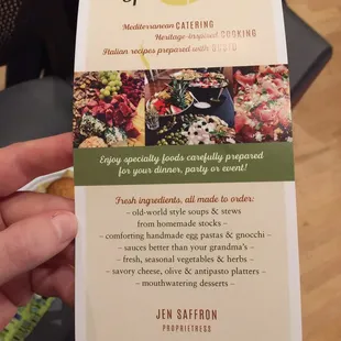 We had this food at a catered event and were impressed!As someone with a Dietitian background I thought the food was particularly healthful and nutritionally balanced with the perfect amount of olive oil added for flavor.The Apple Cider was warm and comforting and hit the perfect balance of sweetness and tartness. I loved the appetizers they give you which include platters of 2 flavors of toasted baguettes, Artichoke Hearts, Grape-leaves, Olives, Soft Cheeses mixed with dried fruits and pomegranate, and various other wholesome health foods.I also loved the way they cooked the Brussels Sprouts and Potatoes and felt they went wonderfully together and had a nice soft texture and kept the naturally delicate flavors of those vegetables without any bitterness. I loved that they had a bean salad with chickpeas and kidney beans as this was a nice protein option that was vegan and most Americans need to include more legumes like these into their daily diet. Like the other foods the oil that was added was the perfect amount to add.The cookie platter also not only had different cookies but different KINDs of cookies which helps provide a more interesting experience.