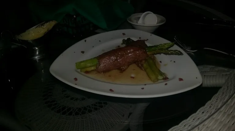 While visiting the area we made a reservation to eat here on a Saturday night over the Labor Day weekend. We had a little trouble finding the place, but when we did it is fair to say that the building is huge. I can see why someone may want to host a shower or even a wedding here. Well I made reservations but it wasn't at all necessary. I requested a table outside but I kind of wished I didn't because the outdoor lighting on the upstairs deck was very poor. It was hard to see anything. Also as I stated the outdoor seating is upstairs through some large rooms, sort of a maze to maneuver around. Not to mention we were the only patrons out here. In retrospect they probably could have told us no, but they accommodated my request. We started off with an appetizer of Stratford's Asparagus. It consisted of asparagus spears wrapped in thin tenderloin strips, char-grilled and crusted with a blend of sugars, served with a hollandaise and sweet teriyaki blend. The appetizer was really great, my only complaint was the hollandaise sauce broke and they could have done away with the teriyaki altogether. It gave the sauce a sweet element that I didn't care for, but the asparagus was wonderfully cooked as was the tenderloin. Next we ordered our entrees. I decided on the Chilean Sea Bass grilled. It came with some sautéed vegetables. As we waited for our entrees we enjoyed watching what was left of the sun go down. It was very pretty, but as I remarked rather dark. Also being the only table up here every time our waitress came to check on us it almost always resulted in her having to go back downstairs to bring us something whether a refill or whatnot. She claimed she liked the exercise, but I am sure it annoyed her. Our entrees came out and they looked great. My fish was cooked right on, and the veg and fish were nicely seasoned. I do have to say, for my personal taste they used WAY too much butter. My fish and vegetables were swimming in a pond of butter. I know butter makes things taste better to some, but for me I wouldn't have ordered grilled fish and veggies if I wanted to pack on the calories. Overall though it was very tasty and I would order again in a heartbeat with a special request of no butter.